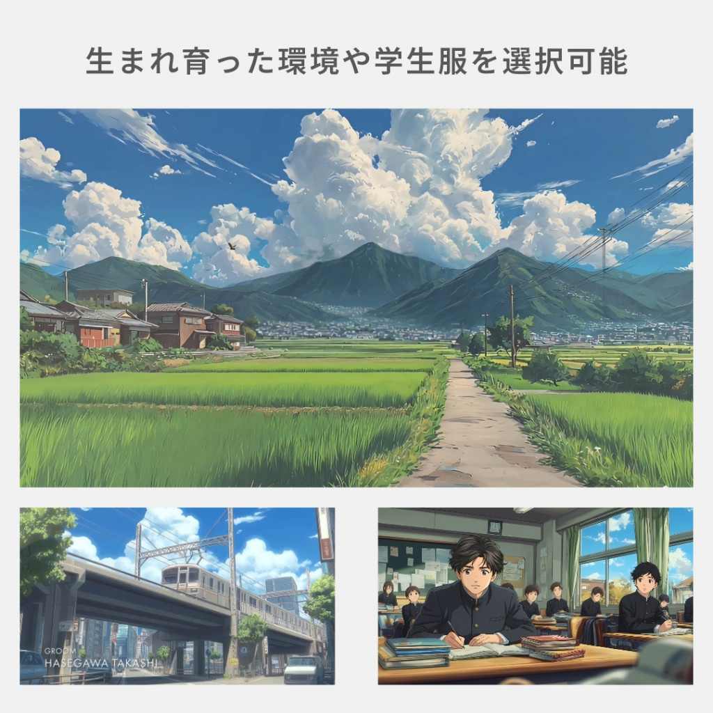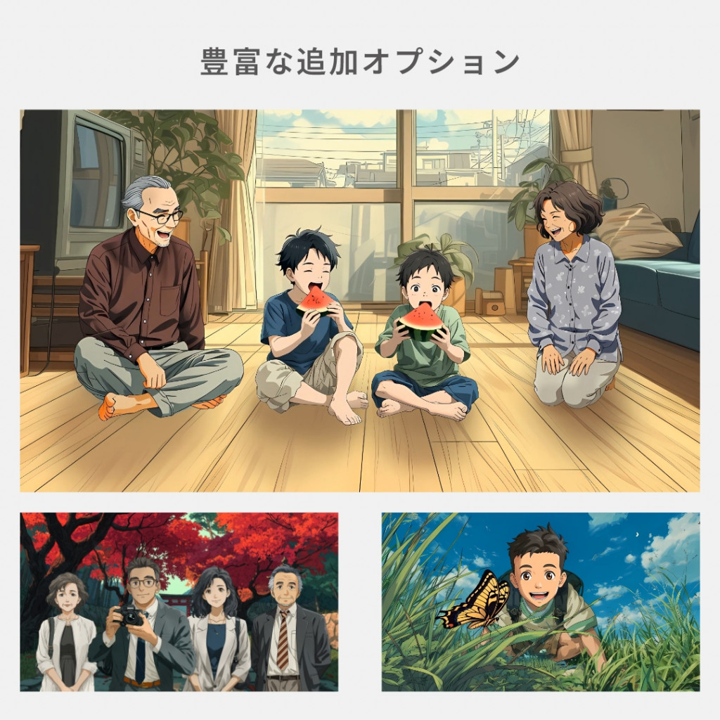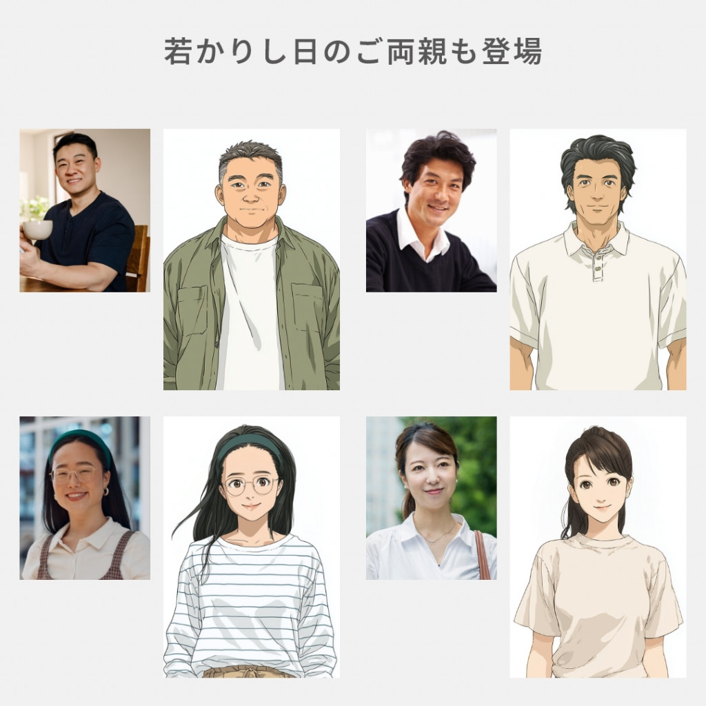 若かりし日のご両親の登場や、兄弟・姉妹の構成、学生時代の服装なども再現可能。豊富なオプションを組み合わせることで、よりオリジナリティあふれる一作に仕上がります。