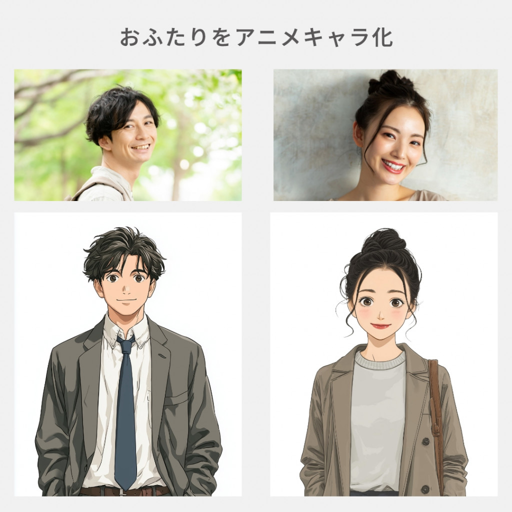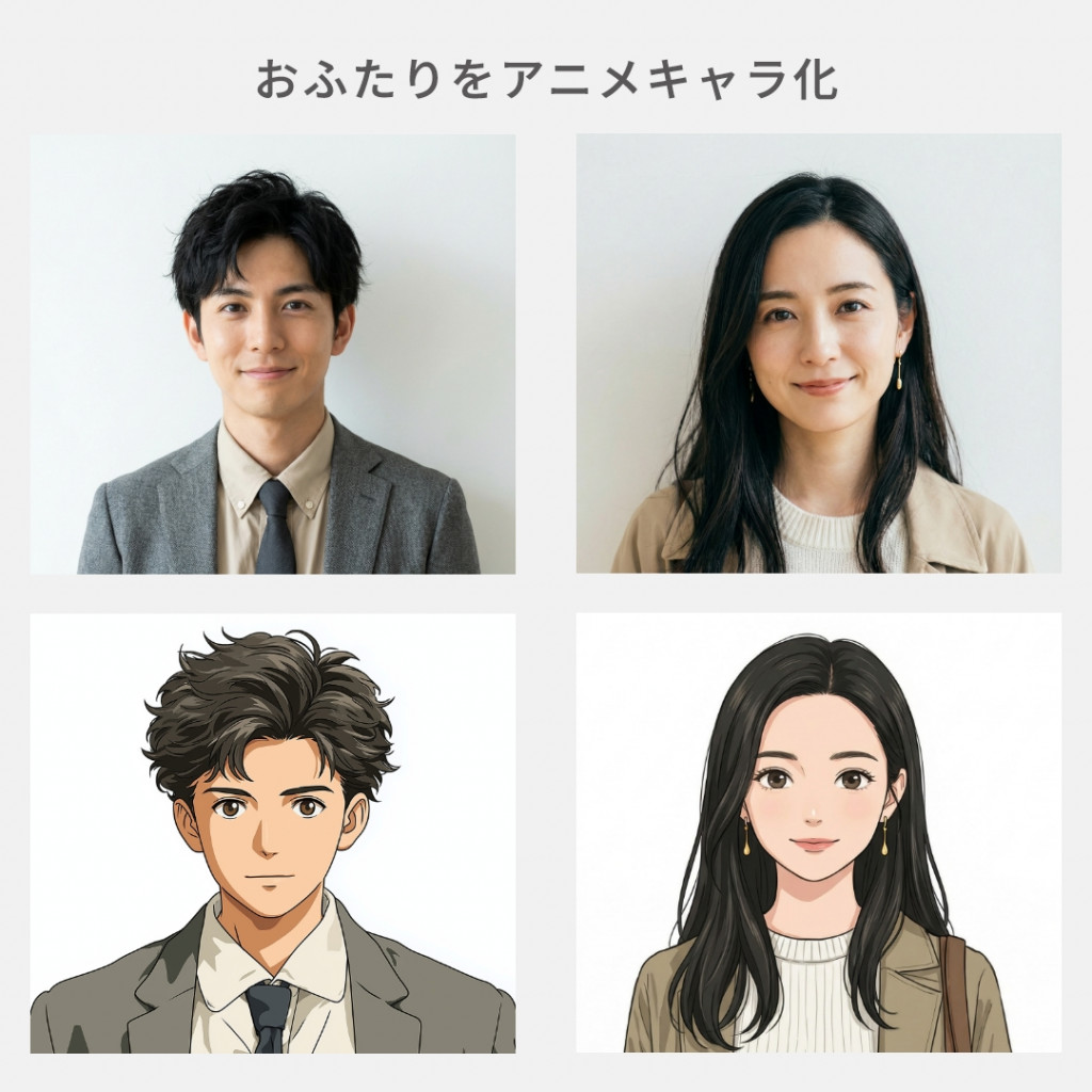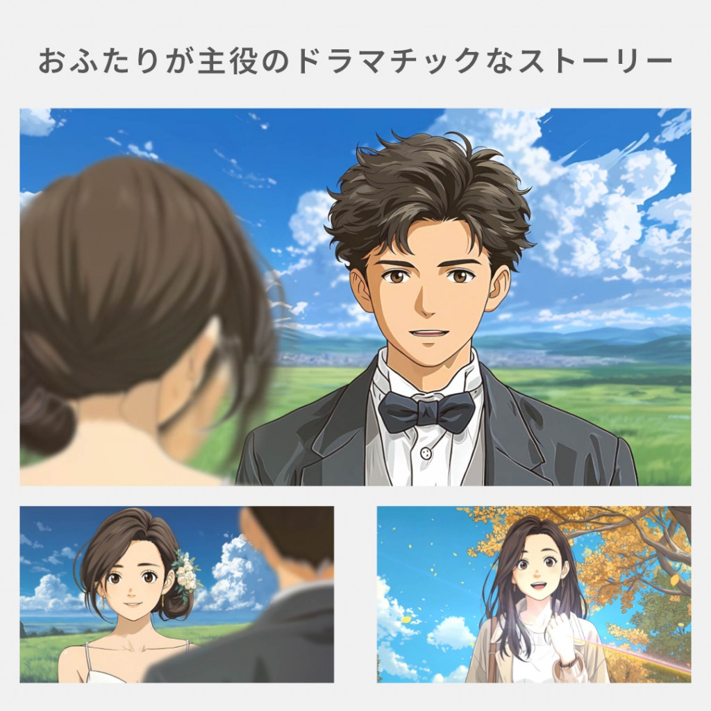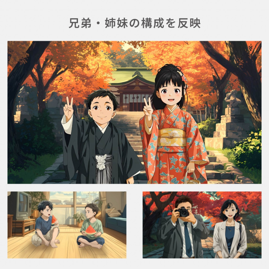 若かりし日のご両親の登場や、兄弟・姉妹の構成、学生時代の服装なども再現可能。豊富なオプションを組み合わせることで、よりオリジナリティあふれる一作に仕上がります。
